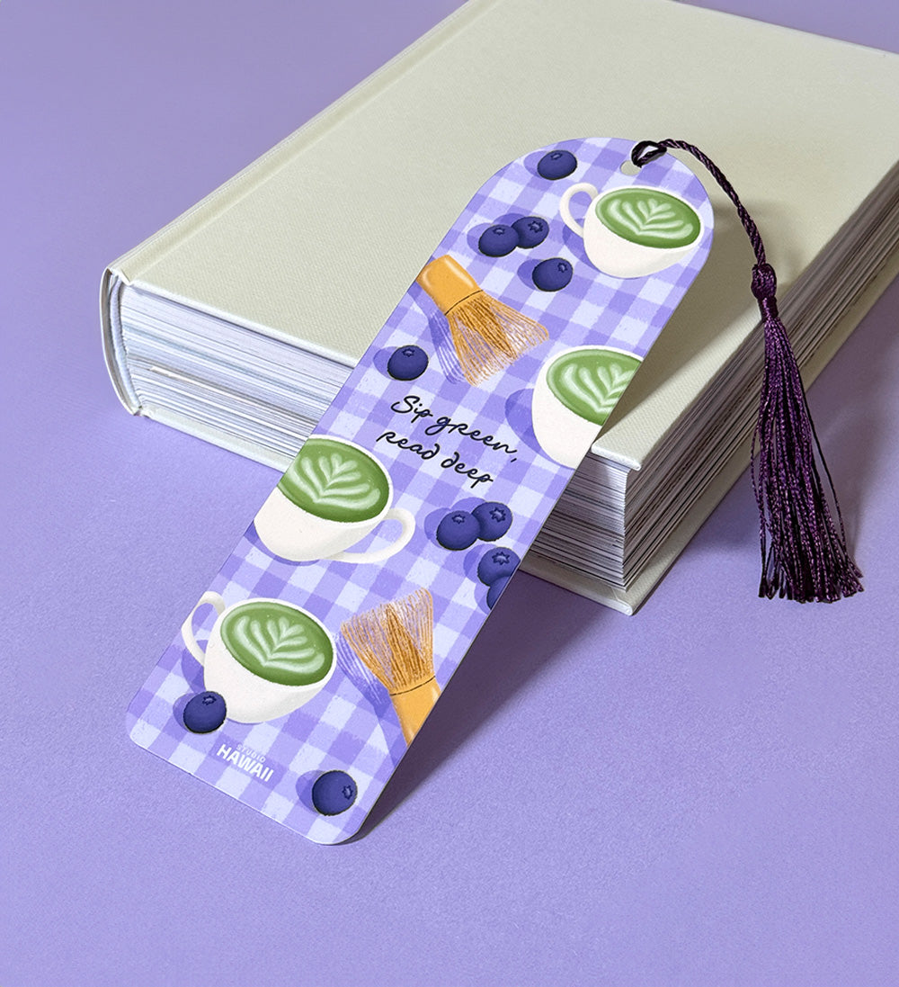 Un joli motif vichy mauve, des myrtilles et un matcha latte, voici un accessoire idéal à glisser entre deux chapitres pour vos moments de lecture.