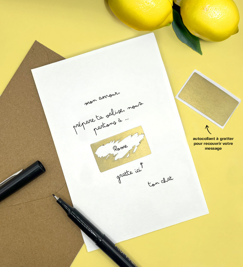 Une enveloppe kraft et une pastille à gratter OFFERTES pour un max d'originalité et de surprise.