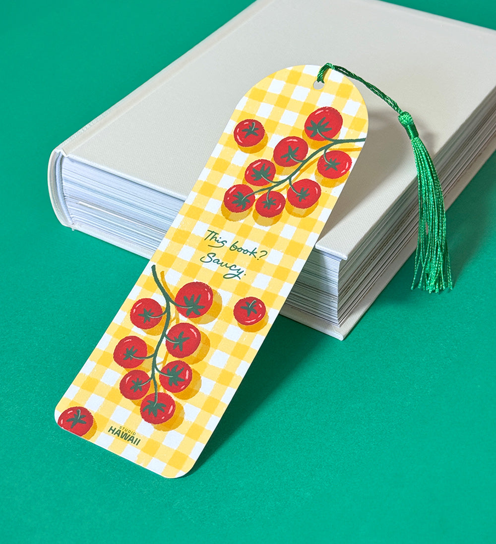 Un joli motif vichy jaune et des petites tomates en grappe, voici un accessoire parfait à glisser entre deux chapitres.