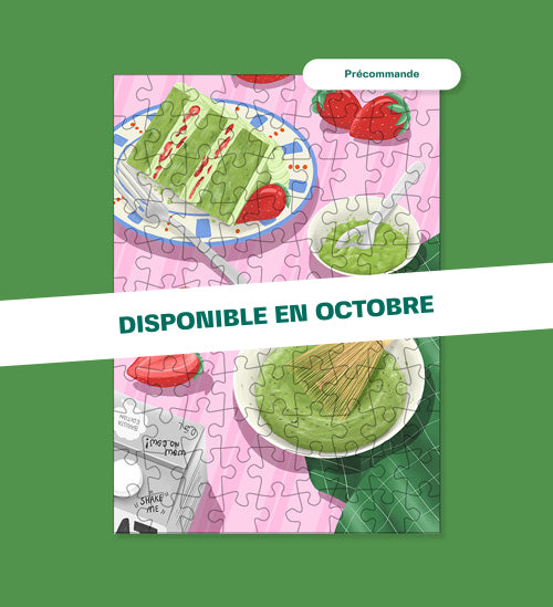 Ce mini-puzzle c'est un moment de détente pure. Il représente tout ce que l'on aime du matcha : la préparation avec son traditionnel fouet en bambou, une part de gâteau au matcha accompagnée de fraises pour une touche de fraîcheur… Un moment suspendu où règne le plaisir !